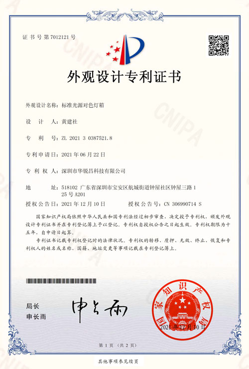 ,擁有標準光源對色燈箱外觀設計專利證書,對色燈箱不但有箱體式的四五六光源對色燈箱,還有吊式印刷看樣臺和立式印刷看樣臺。